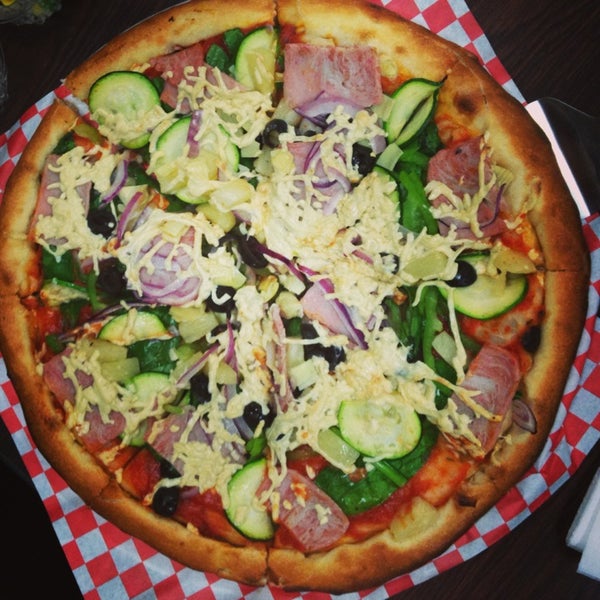 Ham spinach bellpeppers black olives onions pineapple and zucchini You may substitute 1 veggie for veggie or 1 vegan meat for vegan meat topping.
